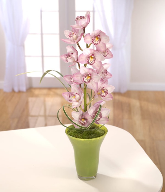 A striking vase arrangement starring pink mini Cymbidium and variegated grass in a contemporary lime green vase.
