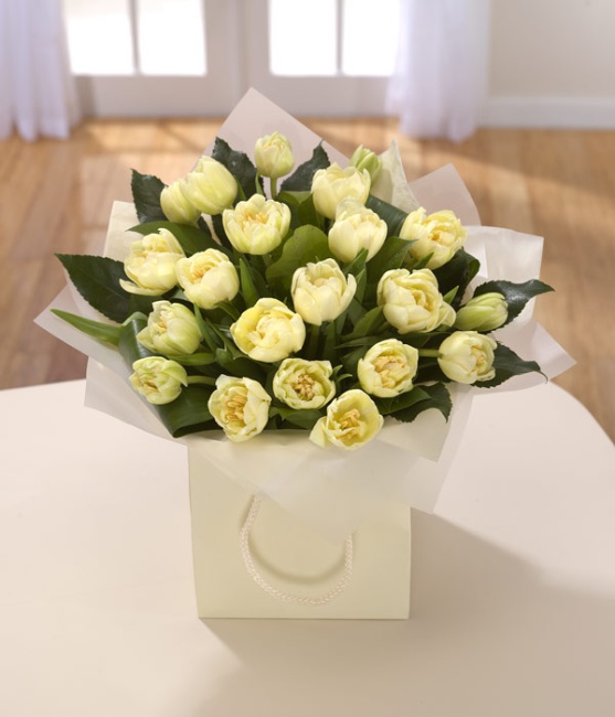 A classic and serene hand-tied of double white Tulips beautifully presented in a cream bag.