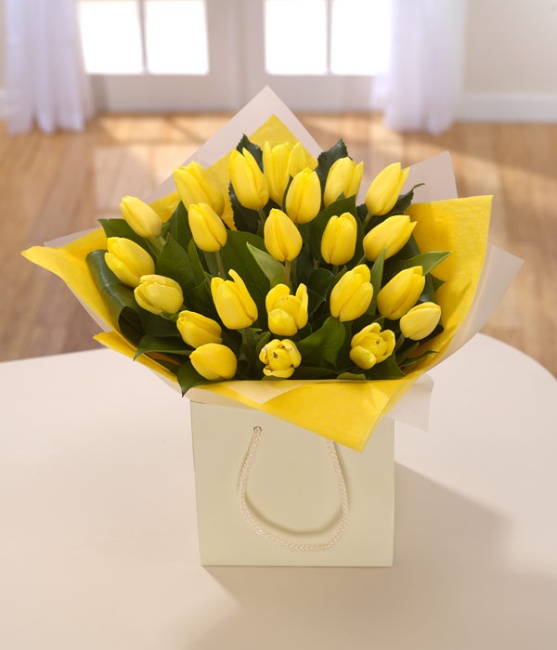 Strikingly simple bright yellow Tulips in a cream gift bag. This dazzling hand-tied will bring a smile to the face of someone special.