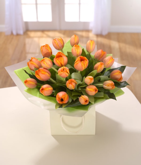 Make somebody's day. Gorgeous orange Tulips beautifully presented in a cream gift bag.