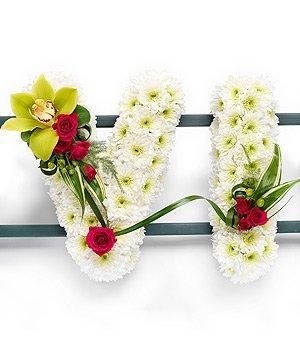 Initial letter tribute. Massed using white chrysanths, with a small spray of flowers on each letter. (sprays shown in red) A very striking and personal tribute.