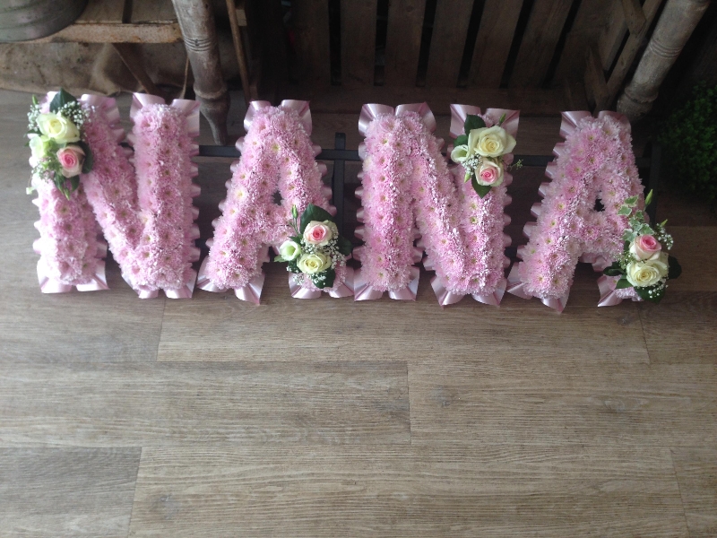A  loving and pretty Nana tribute, each letter has been edged using a pleated pretty pink ribbon and massed in pink,  with white and pink rose sprays
