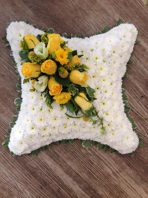 A popular cushion tribute based in white flowers and using a tasteful foliage leaf edging, finished with a bright yellow flower spray.