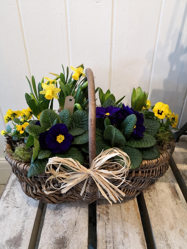 A Large wicker trug basket planted with a variety of seasonal spring bulbs and plants, a beautiful lasting gift.