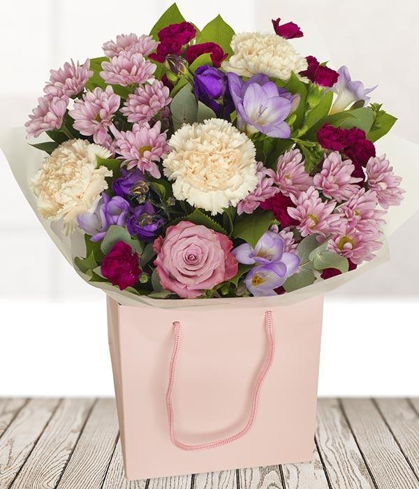 With white carnations and purple freesia popping through this countryside themed hand-tied bouquet. It bursts out freshness and a crisp customer favourite.