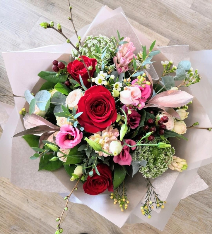 A Beautiful selection of the best blooms in pretty shades of pink and romantic red.